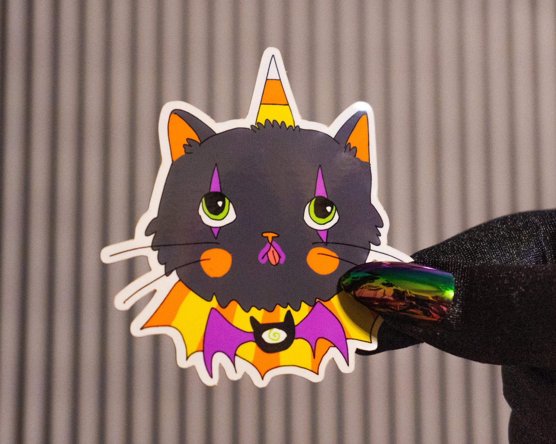 A really spooky but totally adorable Halloween cat clown sticker that you can put just about anywhere.